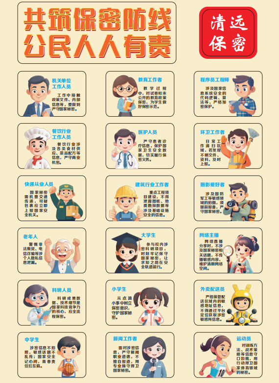 为确保次宣传活动达到最佳效果,清远市保密局精心策划,在活动筹备阶段积极与市文广旅体局、市电视台等单位对接,沟通和探讨如何巧妙地将保密宣传融入赛事流程。同时,设计制作一批独特又涵盖保密宣传的宣传品。其中,“共筑保密防线公民人人有责”主题贴纸尤为吸睛。贴纸以18个常见职业的原创漫画人物为亮点,人物形象生动活泼,极具感染力。每个漫画人物都融入了所在行业的保密相关内容,不仅画面精美,还能让群众在观看贴纸的同时,学会实用的保密知识,以直观简单的方式向大众传递“保密就在身边”的理念。