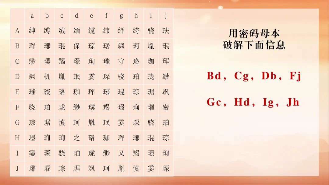 “永不消逝的电波”:在革命年代党的地下工作者为躲避敌人搜查,创造出多种情报传递手段。游戏以历史为蓝本,参与者模拟加密通信,利用密码母本等密码工具传递情报、破解信息,体会历史中革命先辈的卓越智慧。