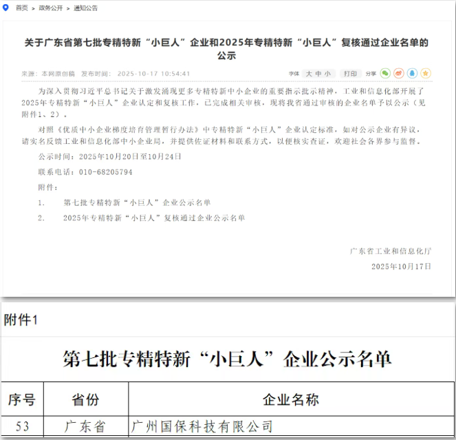 2025年10月17日,广东省工业和信息化厅正式公布第七批专精特新“小巨人”企业公示名单,国保科技凭借卓越的技术实力、创新能力和行业影响力成功入选。