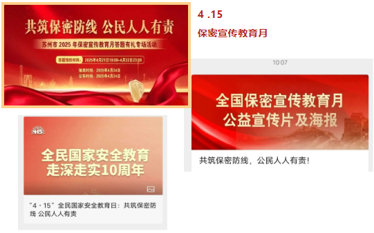 苏州市县保密管理部门与机关企事业单位和学校科研院所共同打造保密法治宣传合力,持续推动保密法治宣传走深走实。接下来,苏州市将继续巩固“4·15”全民国家安全教育日保密法治宣传成果,结合保密法治新形势、新任务、新要求,不断深化保密行业领域法治宣贯,着力推动保密科技应用与安全贯彻落实,在服务全市高质量发展,加快推动新质生产力的大局中贡献更多力量。