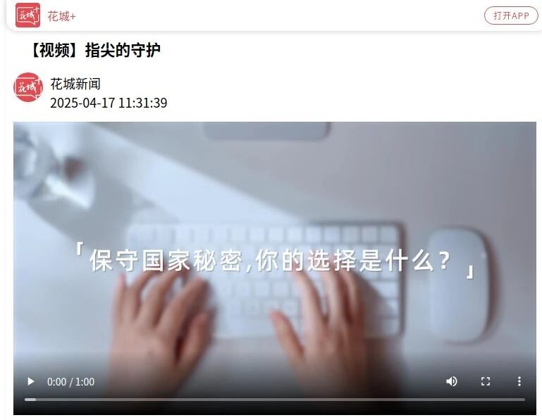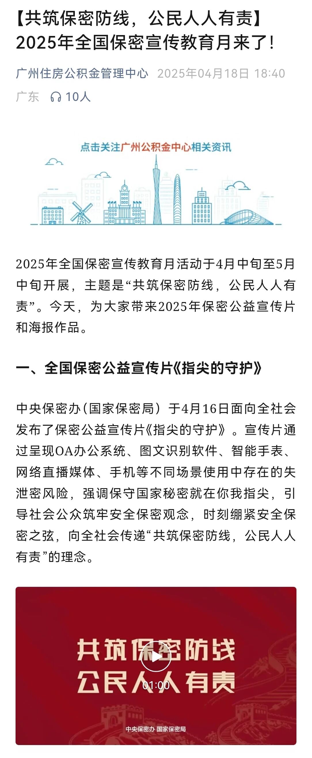 4月18日至5月20日,广州电视台南国都市频道、法治频道、影视频道、经济交通广播、青少年广播将每天循环播放保密公益宣传片《指尖的守护》。保密就在你我指尖,就在你我身边。